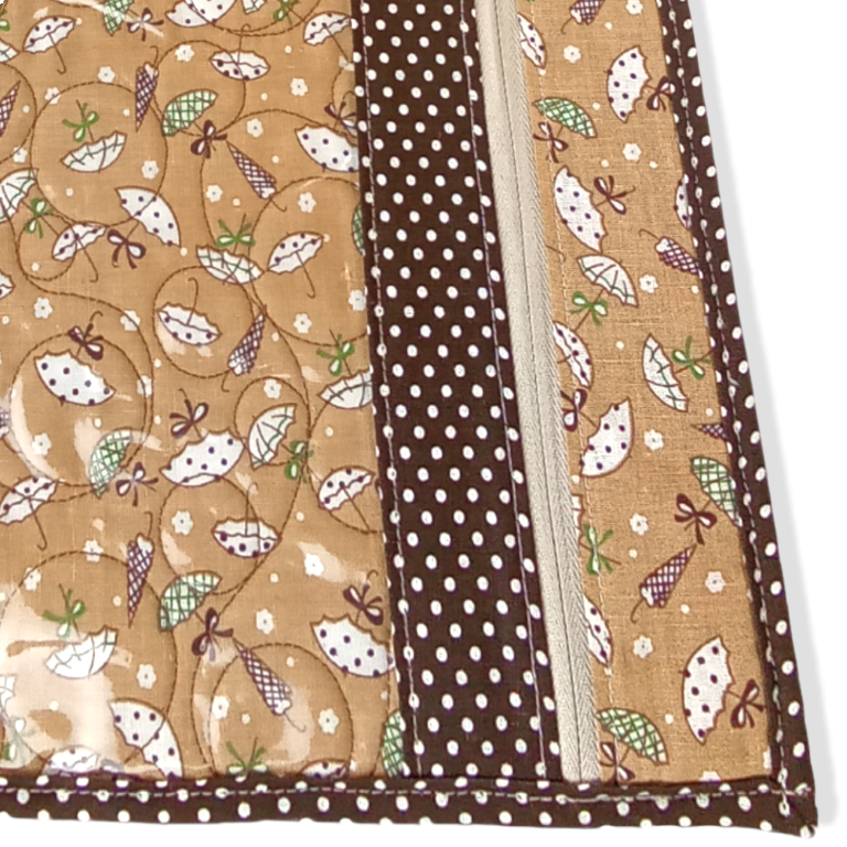 Cream Umbrellas Clear Vinyl Front Project Bag – 12″ x 13″ (30 x 33 cms) This medium Cream and Brown Umbrella Vinyl Front Project Bag is perfect for storing your cross stitch, knitting, crochet, quilt pieces and any other craft project. Made with 100% cotton in a brown polka dot design with a cream umbrella design interior. It has been sandwiched together with a polyester wadding and quilted with a bubble design in contrasting thread. It comes fully lined with no exposed seams with a nylon zipper and finished off with a zipper pull with a wooden button The vinyl front is high grade and is ideal for seeing your projects at a glance with no need to open the bag. Perfect for travel. The bag shows an 8″ square qsnap, so there is plenty of room for all your supplies. PLEASE NOTE: Contents of bag NOT included (demonstration only) Thank you for taking the time to view my handmade items.