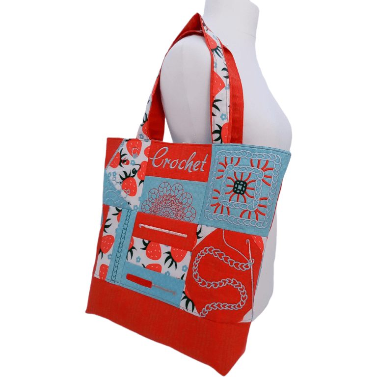 Crochet Project Bag Quilted and Embroidered Tote – Strawberries This extra large embroidered crochet project bag tote is perfect for storing your knitting or crochet projects , or you may simply want to use it as a day to day shopping tote Made with 100% cotton in strawberry theme in red and blue shades with embroidered with crochet stitch pattern details. Large interior with flat bottom. Oodles of room to store your patterns, needles, yarn and project. It has been sandwiched together with a polyester wadding and medium weight interfacing. It comes fully lined with blue and white stripy fabric with no exposed seams and seals with a self covered button with the matching fabric. Perfect for travel. Bag Size: 44.5cm wide x 39.5cm high x 10cm deep (17.5″ x 15.5″ x 4”) Handle Size: 3.5cm wide x 53cm long x 27cm high (1.5″ x 21″ x 9.5″) PLEASE NOTE: Contents of bag NOT included (demonstration only) Thank you for taking the time to view my handmade items.