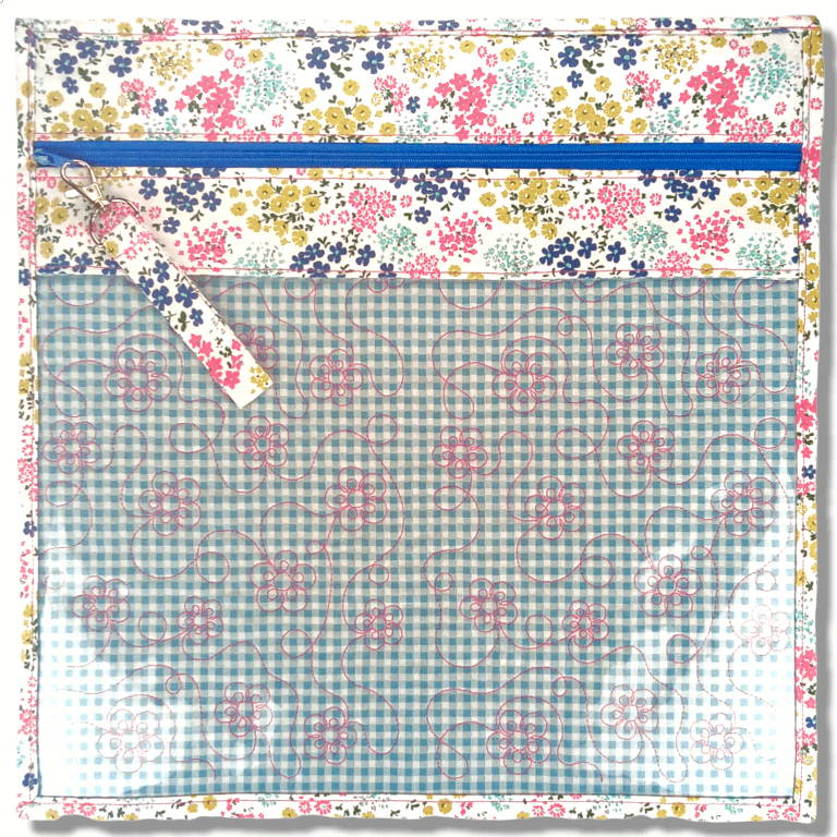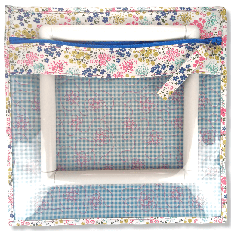 Floral Gingham Clear Vinyl Front Project Bag – 14″ x 14″ (35.5 x 35.5 cms) This large pretty floral Vinyl Front Project Bag is perfect for storing your cross stitch, knitting, crochet, quilt pieces and any other craft project. Made with 100% cotton in a lovely floral design in colourful floral colours with a blue gingham interior. It has been sandwiched together with a polyester wadding and quilted with a pretty floral design in contrasting thread. It comes fully lined with no exposed seams with a nylon zipper and finished off with a contrasting zipper pull Attached with metal clasp which is removable. The vinyl front is high grade and is ideal for seeing your projects at a glance with no need to open the bag. Perfect for travel. The bag shows an 8″ square q-snap, so there is plenty of room for all your supplies. PLEASE NOTE: Contents of bag NOT included (demonstration only) Thank you for taking the time to view my handmade items.