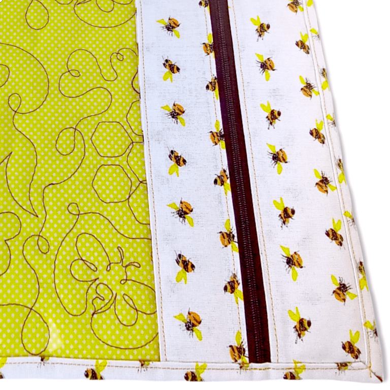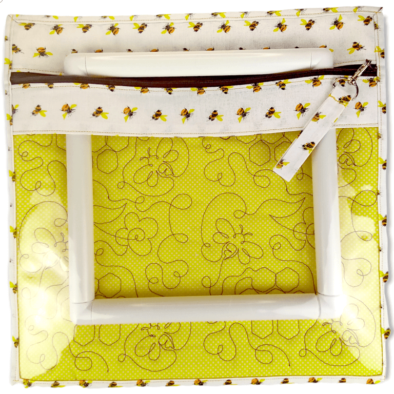Honey Bees Clear Vinyl Front Project Bag – 14″ x 14″ (35.5 x 35.5 cms) This large Save The Bees Vinyl Front Project Bag is perfect for storing your cross stitch, knitting, crochet, quilt pieces and any other craft project. Made with 100% cotton in a lovely bright design in summer colours with a pale salmon pink interior. It has been sandwiched together with a polyester wadding and quilted with a bees and honeycomb design in contrasting thread. It comes fully lined with no exposed seams with a nylon zipper and finished off with a contrasting zipper pull. Attached with metal clasp which is removable. The vinyl front is high grade and is ideal for seeing your projects at a glance with no need to open the bag. Perfect for travel. The bag shows an 8″ square q-snap, so there is plenty of room for all your supplies. PLEASE NOTE: Contents of bag NOT included (demonstration only) Thank you for taking the time to view my handmade items.